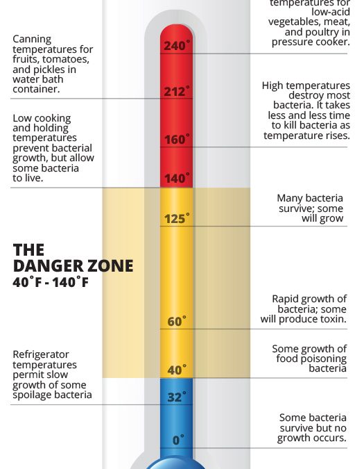 2. Live by the Danger Zone. I don’t mean the song, although that would be pretty cool. The Danger Zone is the temperature range of 40-140 degrees Fahrenheit and is one of the most important concepts in food safety. This is the range where you want to minimize how long food hangs out at as this is when bacteria grows the fastest. Cold foods should be kept below 40 degrees, hot foods above 140 degrees. Remember the 4 hour rule. If it has sat at this range 4 hours or longer, toss it. Not worth the risk. Make sure your fridge is holding at least 40 degrees or colder.