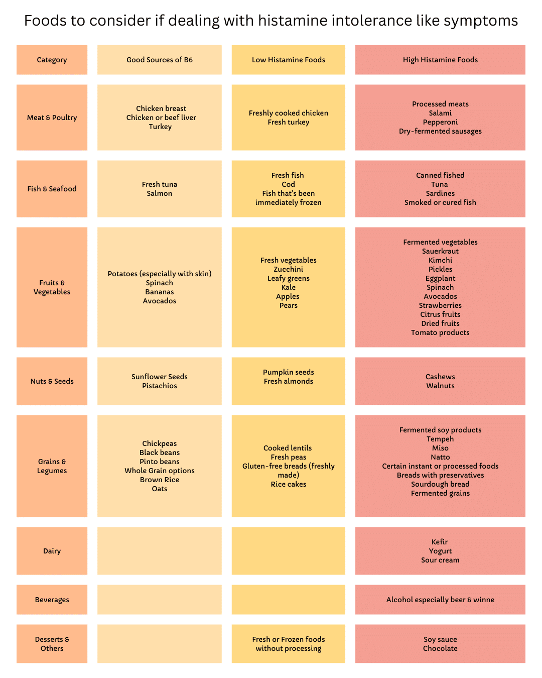 Below, you will find a list of high Vitamin B6 foods, low histamine foods, and high histamine foods to consider.